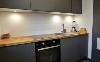 kuchnia z meblami wykonanymi w zabudowie oraz pełnym wyposażeniem AGD: kuchenka, piekarnik, zmywarka oraz pralka,